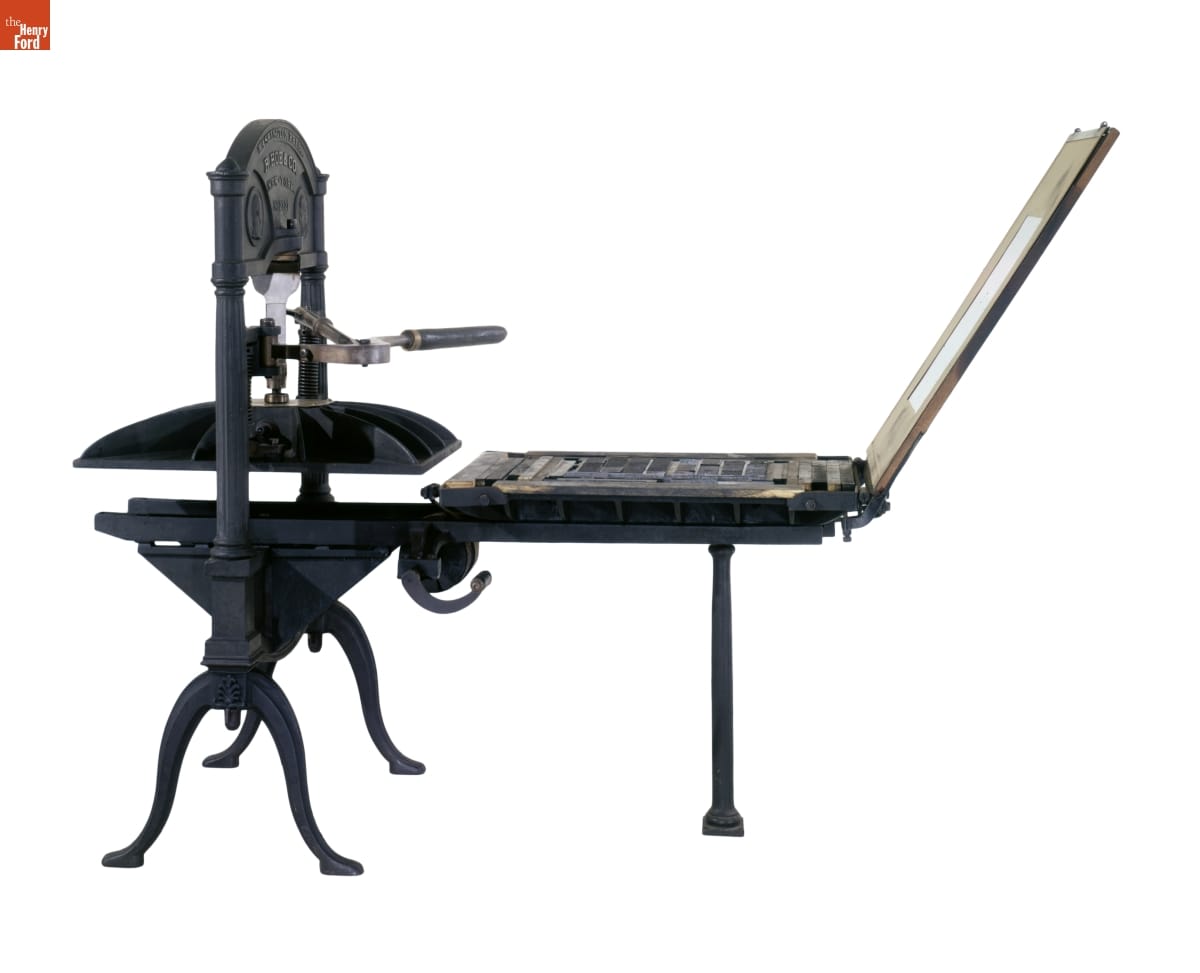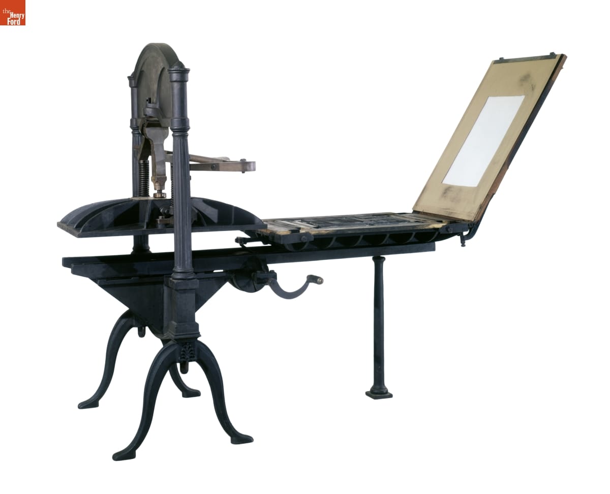 This peripatetic press was used to print newspapers in the 19th-century American West. Washington hand presses were rugged and extremely popular; this one crossed the Isthmus of Panama on its way from New Orleans to California's gold fields. In 1851, the press's owner, John Judson Ames, started San Diego's first newspaper. The press also printed newspapers in San Bernardino and Independence, California, and in Aurora, Nevada.