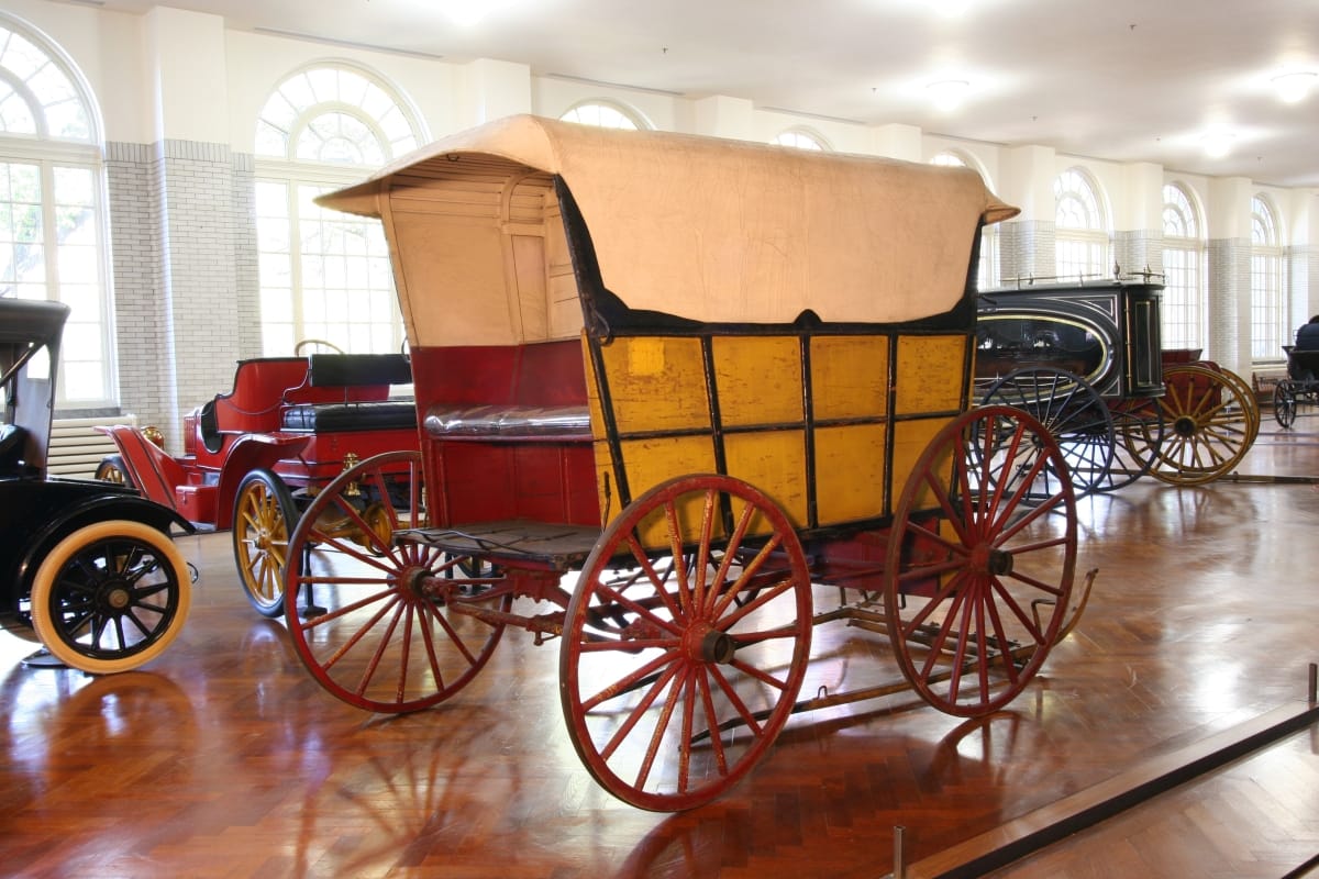 Before mechanical refrigeration, many Americans bought their perishable goods on a daily basis. In larger cities, enterprising vendors delivered food door-to-door in wagons like this. Inside the butcher's wagon are shelves for meat storage, slots to hold knives, and a cutting board. The vehicle was built in Connecticut by A.U. Elliott & Sons Carriage Manufacturers.