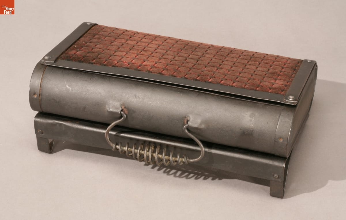 This X-Radium footwarmer made by the Novelty Manufacturing Company in Jackson, Michigan, depended on radiant heat from a special patented brick placed inside. Users had to remember to heat the brick before their trip.