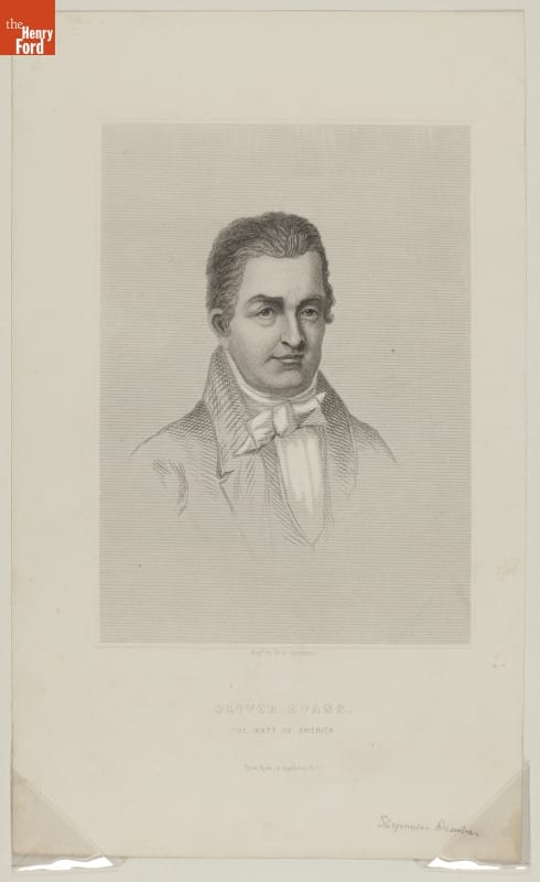 A visionary inventor and engineer, Oliver Evans (1755-1819) helped shape American manufacturing. In the late 1700s, Evans developed a continuous conveyor system for milling flour that revolutionized the industry and influenced the design of future automated factories. In 1804, he patented America's first high-pressure steam engine. Evans' new engine was reliable and versatile -- it was adapted for use in both manufacturing and steamboat propulsion.