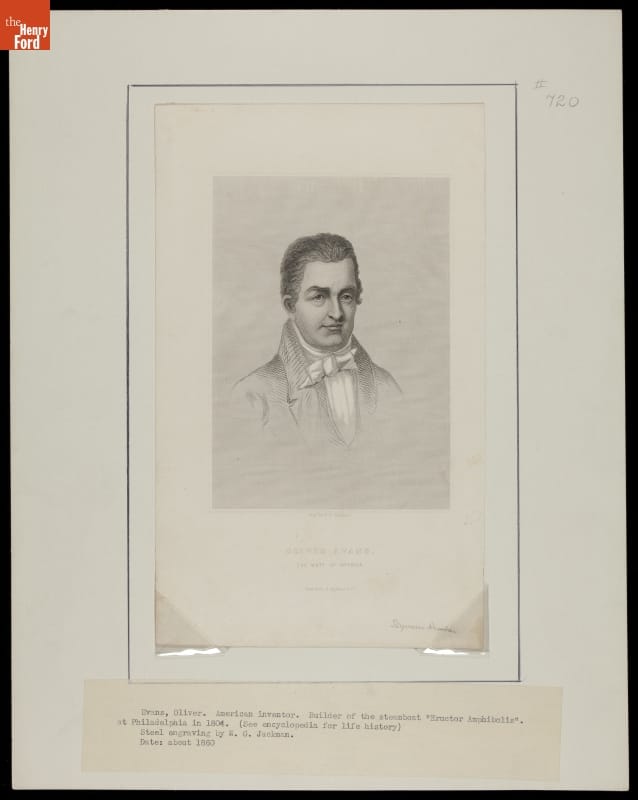 Typed paper adhered to mat board: Evans, Oliver. American Inventor. Builder of the steamboat "Eructor Amphibolis"./ at Philadelphia in 1804 (See encyclopedia for life history) / Steel engraving by W.G. Jackman. / Date: about 1860