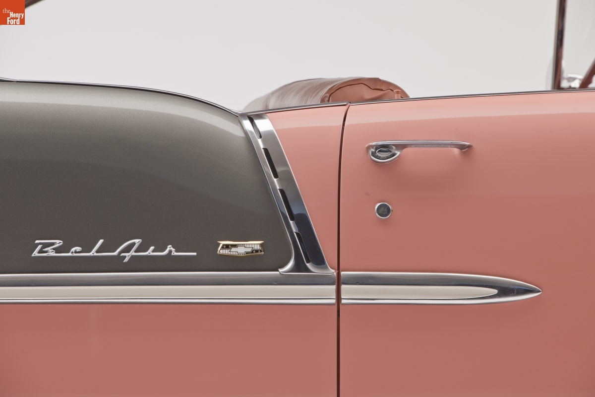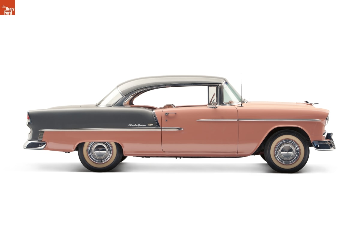 Chevrolet turned its image around in 1955. Its new V-8 engine was light modern, powerful and reliable. Combined with a clean, classic new body style it changed customers' impression of Chevrolet from stodgy and conservative to sporty and youthful almost overnight. This car, in fashionable coral and smoke grey colors, epitomizes Chevy's new slogan, "The Hot One."