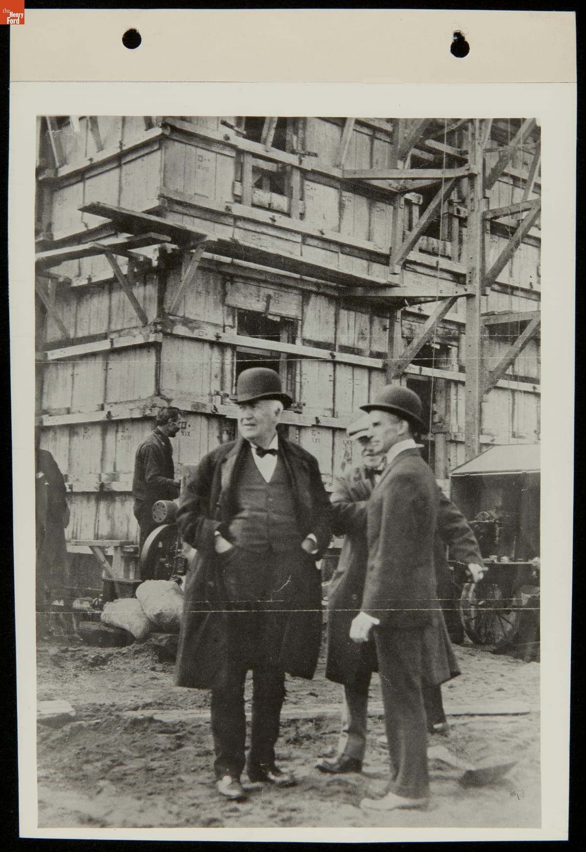Thomas Edison and William Meadowcroft Inspecting a Poured Concrete House with Fred Fowler, 1919