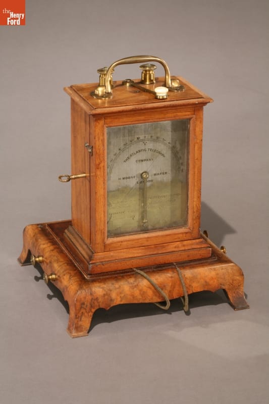 Inscribed on the silver-plated portion of the face of the instrument: THE ATLANTIC TELEGRAPH / COMPANY / H. MOORE MAKER / LONDON Inscribed on the face in area stripped of silver plating: THE MESSAGE FROM HER MAJESTY QUEEN VICTORIA TO THE PRESIDENT OF THE UNITED STATES (JAMES BUCHANAN) WAS RECEIVED ON THIS INSTRUMENT IN AUGUST 1858 Inscribed in the brass on verso of instrument: Upon this GALVANOMETER nearly the whole of the messages sent from VALENTIA through the ATLANTIC CABLE to NEWFOUNDLAND were received, and were read there on at Newfoundland in August and September 1858, Mr J.C. Laws being the Company's Electrician in Newsfoundland and Mr. George Saward being the Secretary to the Company at that date. Inscribed plate on underside of case: Bonded U.S. Customs/ Detroit Entry/ Permanant Exhibition #1 / Jan. 16 1934 / Edison Institute