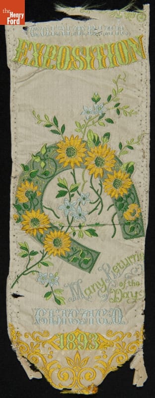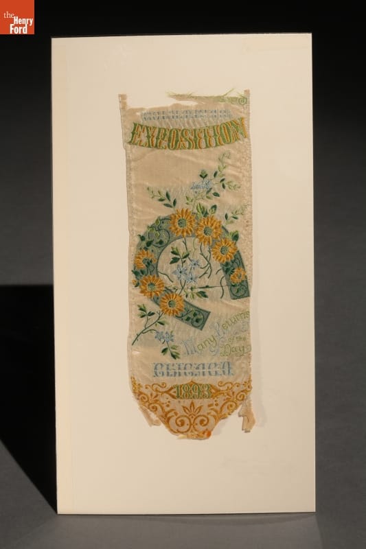 The World's Columbian Exposition celebrated the 400th anniversary of Christopher Columbus's landing in America. More than 25 million visitors attended the Chicago fair in 1893. Many fairgoers returned home with souvenirs, such as this commemorative silk bookmark.
