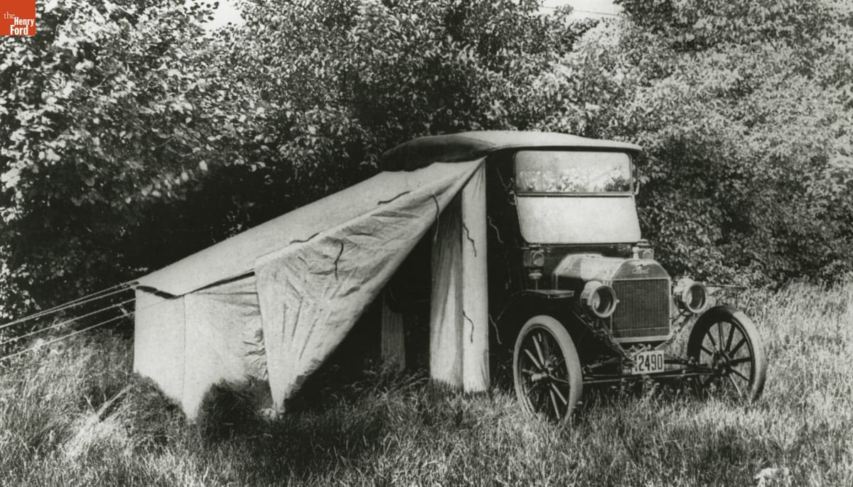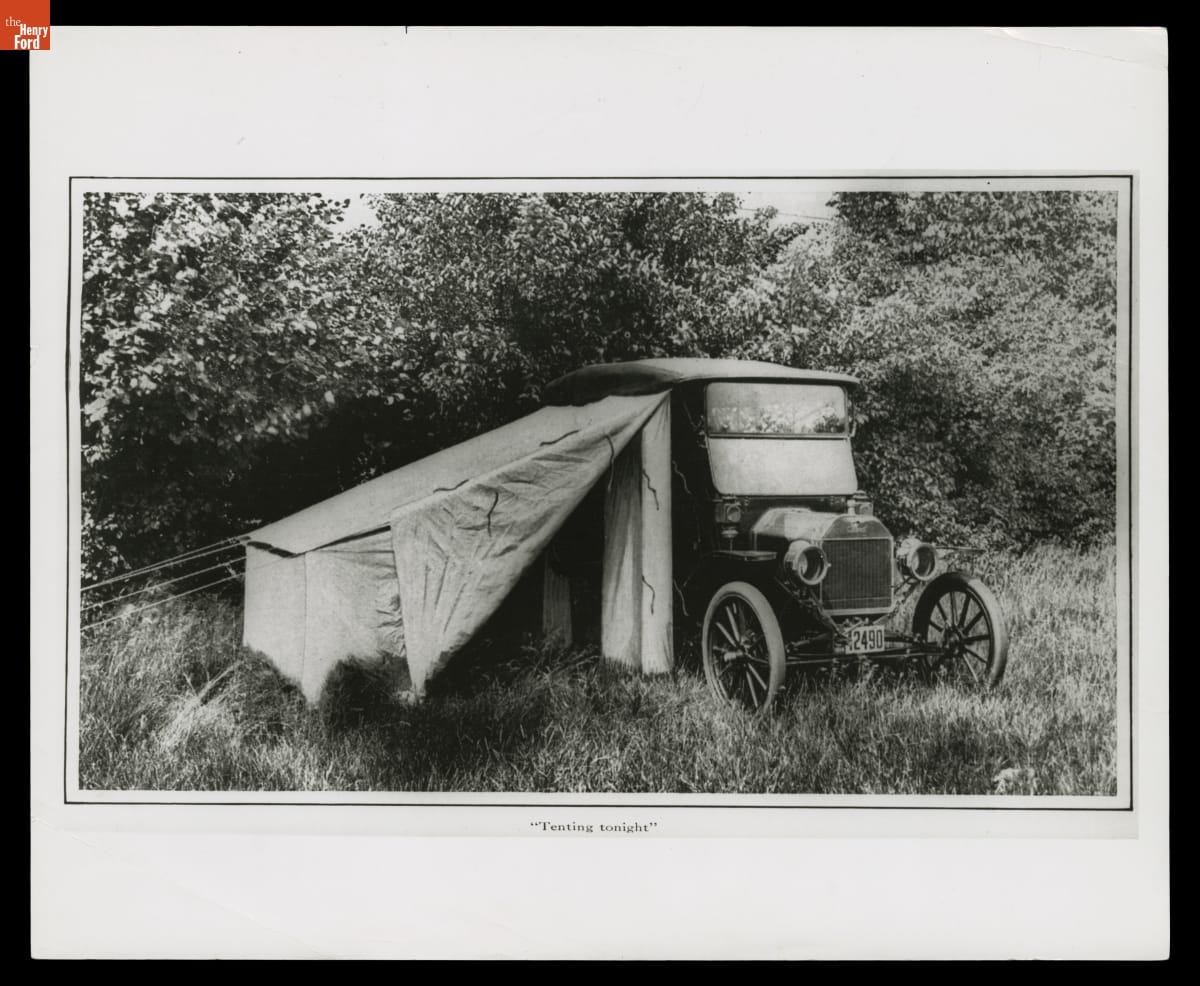 Better roads and the increased availability of automobiles fueled an autocamping craze in the 1910s and 1920s. Many middle class motorists packed a tent, cots, and food, hit the road, and camped wherever they pleased. This inventive setup incorporated the campers' Model T, which anchored their tent and offered additional shelter or storage space.