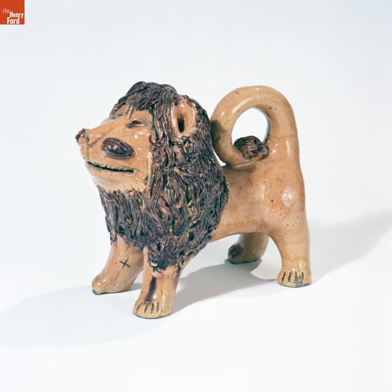 Early German immigrants to Pennsylvania -- known as the Pennsylvania Germans -- were known for their particular aesthetic style, which they used to decorate documents, furniture, textiles, and pottery. Whimsical animals -- like this lion, created by notable Pennsylvania German potter John Bell -- were an oft-used motif.