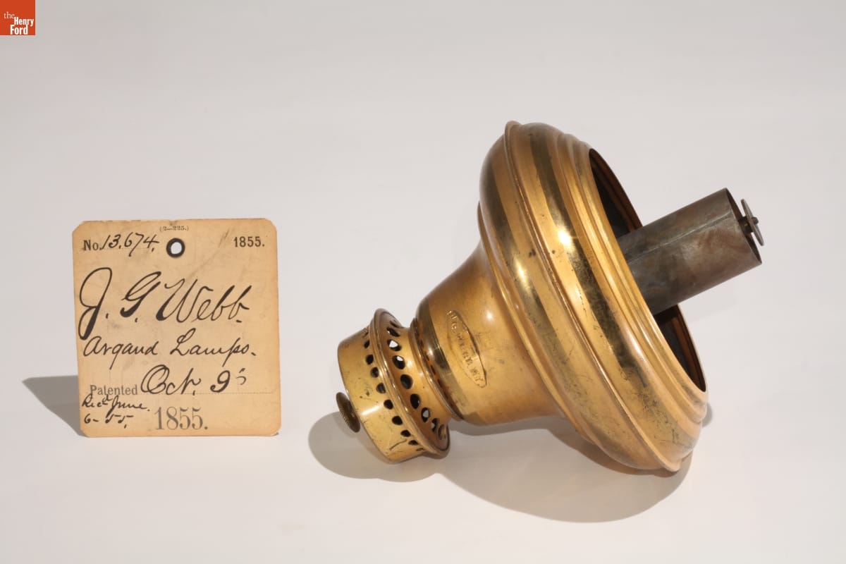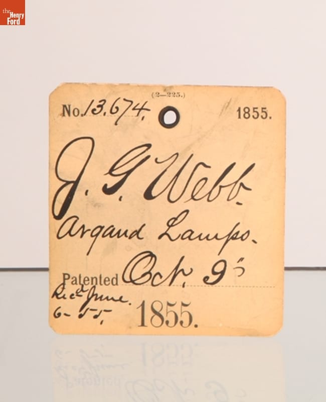 Plaque on side of font: J. G. WEBB. N.Y. Patent office tag reads: NO. 13674 1855 / J.G. WEBB. / ARGAND LAMPS. / PATENTED OCT. 9 / 1855 / REC. JUNE. / 6-55.