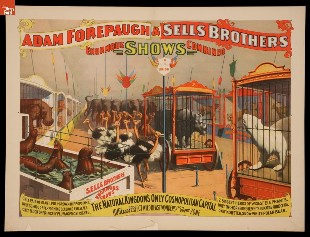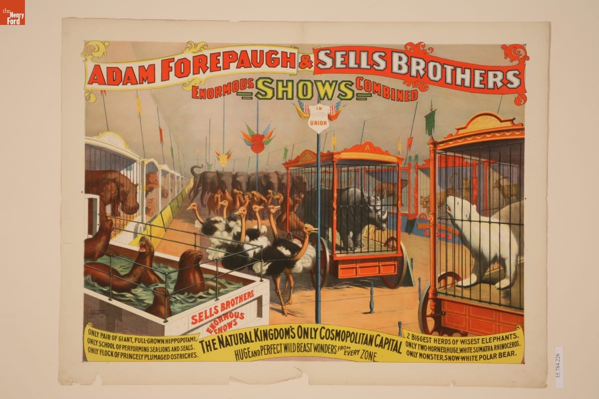 Circus poster printed at top: ADAM FOREPAUGH & SELLS BROTHERS / ENORMOUS SHOWS COMBINED / IN MIGHTY / UNION Printed at bottom: ONLY PAIR OF GIANT, FULL-GROWN HIPPOPOTAMI. / ONLY SCHOOL OF PERFORMING SEA-LIONS AND SEALS. / ONLY FLOCK OF PRINCELY PLUMAGED OSTRICHES. / THE NATURAL KINGDOM'S ONLY COSMOPOLITAN CAPTIAL / HUGE AND PERFECT WILD BEAST WONDERS FROM EVERY ZONE. / 2 BIGGEST HERDS OF WISEST ELEPHANTS. / ONLY TWO-HORNED, HUGE, WHITE SUMATRA RHINOCEROS. / ONLY MONSTER, SHOW-WHITE POLAR BEAR.