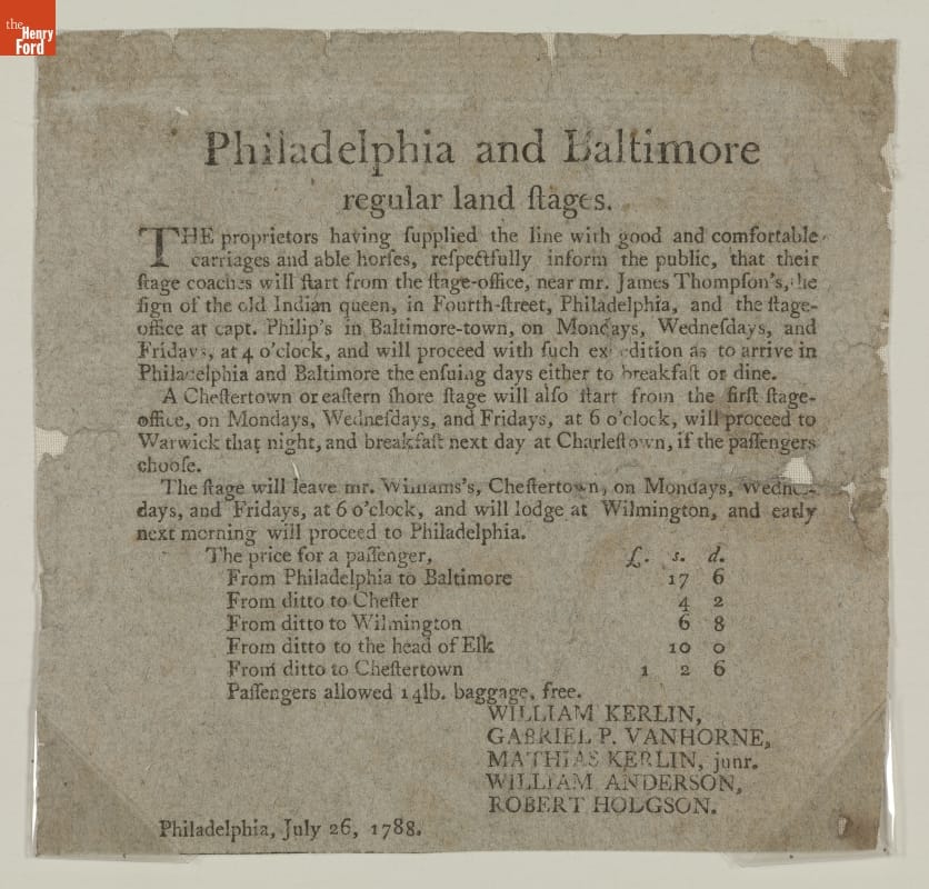 This small advertising broadside from 1788 gives the schedule of trips and rates of fare for a stage-coach line that ran between the "Indian Queen" Tavern in Philadelphia, Pennsylvania, and Captain Philip's in Baltimore, Maryland.