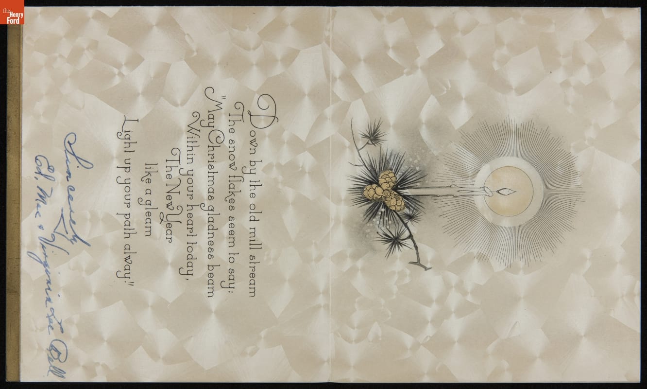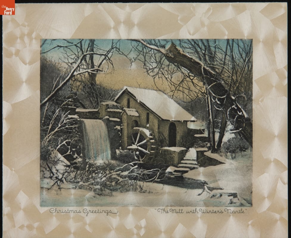 Mailing colorful, commercially designed greeting cards had become an American tradition by the 1920s and 1930s. Friends and neighbors commonly exchanged cards that wished one another a merry Christmas or happy New Year during the winter holidays. Publishers sometimes decorated these cards with nostalgic images of mills, churches, or covered bridges steeped in snow.