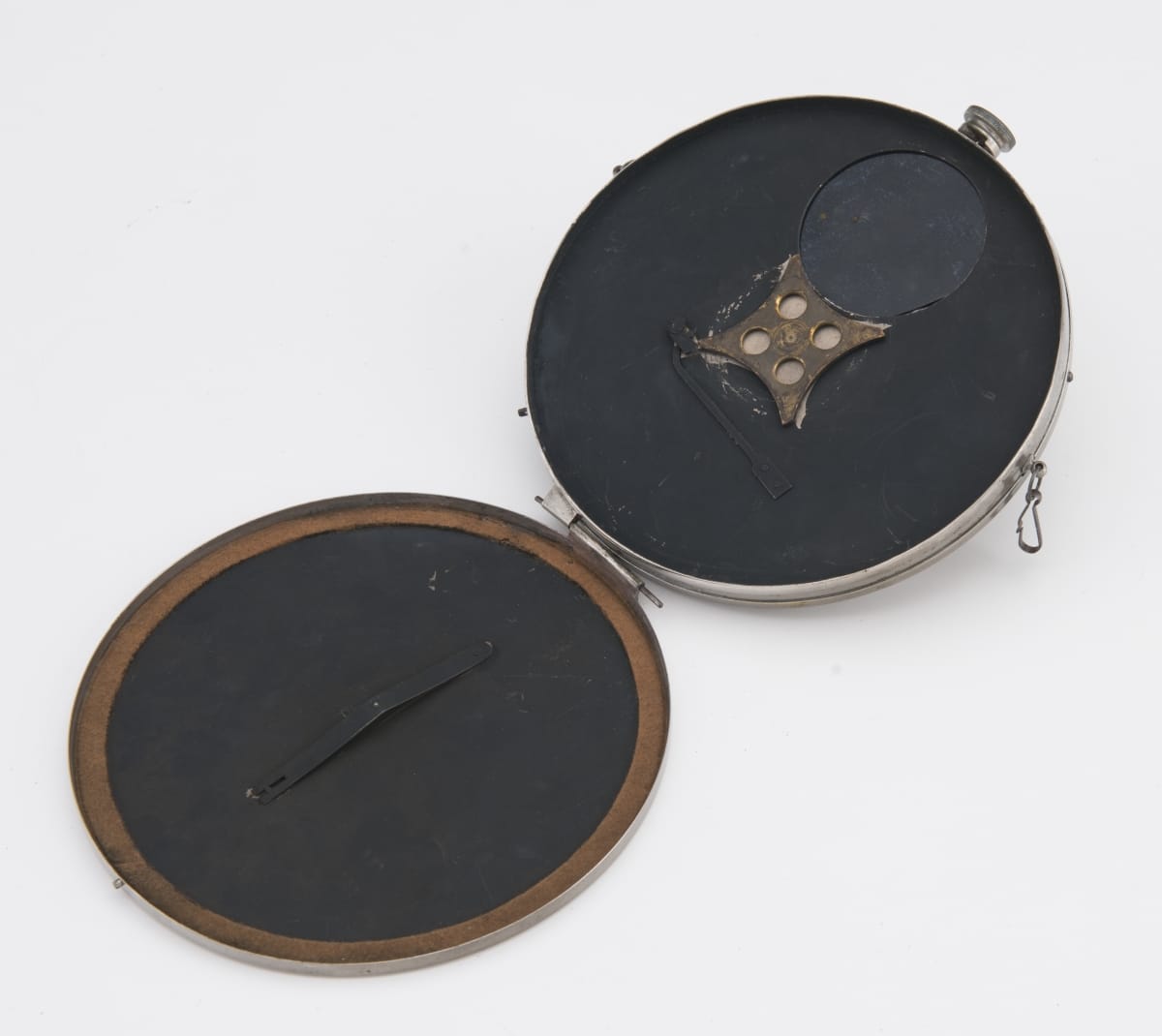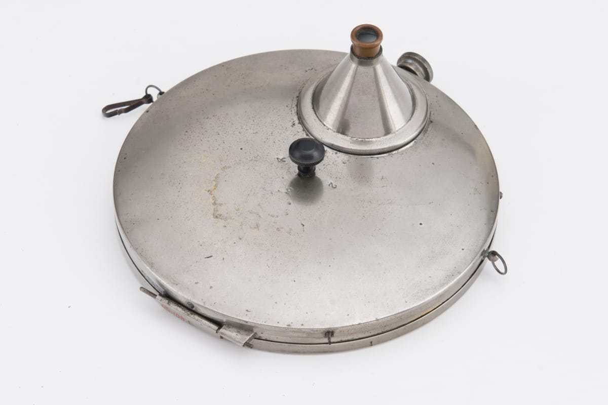 In 1885, Robert D. Gray created one of the earliest commercial spy cameras. It was designed for concealment: worn under a shirt, with the small lens protruding from a button hole. The spring shutter on the flat disc could be triggered with little suspicion. After each image was taken, the glass plate inside the disc rotated, producing small round photographs.