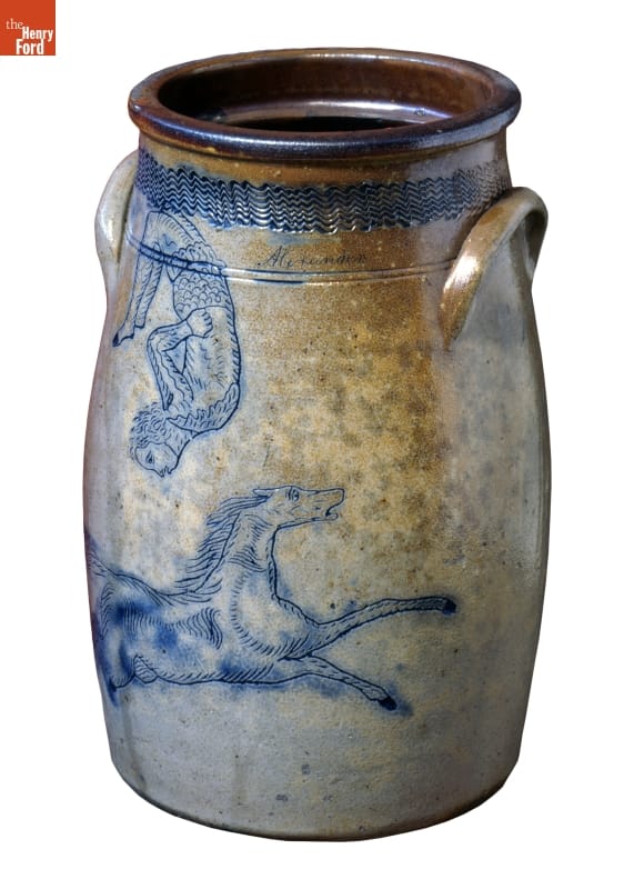 This butter churn was made of a durable, leak-proof pottery called stoneware, shaped on a potter's wheel. The orange-peel-like outer glaze was created when the potter threw handfuls of common rock salt into a white-hot kiln during the piece's firing. Salt-glazed stoneware pieces were decorated with an amazing array of designs, including the unusual acrobat and horse on this piece.