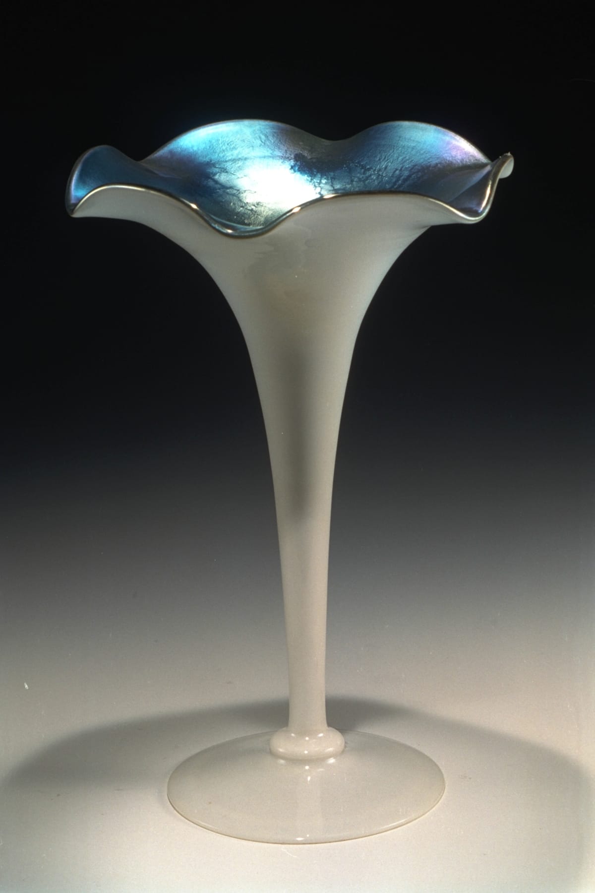 Aurene was the name that Frederick Carder used for his iridescent art glass at the Steuben Glass Works made in Corning, New York. The glass produces a prismatic effect when light reflects across the surface. This elegant, floral-shaped vase combines a cased white outer shell with a dark blue iridescent interior. Steuben made many varieties of colored Aurene glass until 1932, when it moved toward more modern shapes.