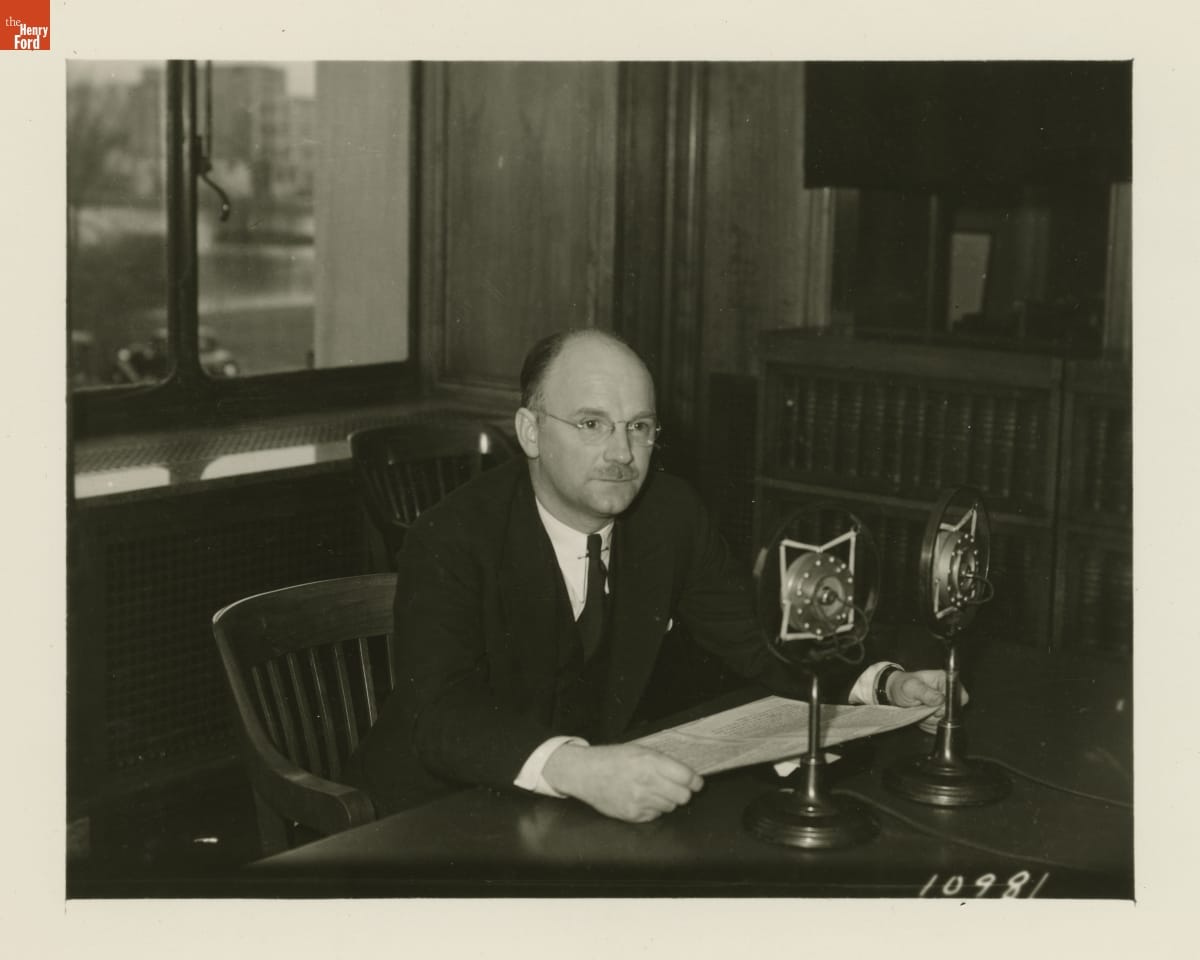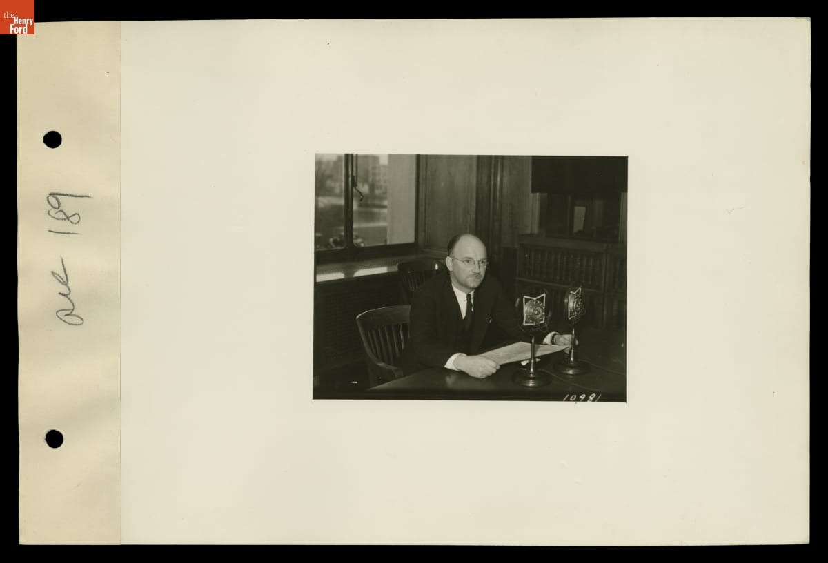 Ford Motor Company Engineer Larry Sheldrick Making a Radio Broadcast, December 19, 1933