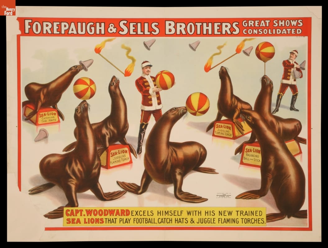 Printed at top: FOREPAUGH & SELLS BROTHERS GREAT SHOWS / CONSOLIDATED. Printed below: CAPT. WOODWARD EXCELS HIMSELF WITH HIS NEW TRAINED / SEA LIONS THAT PLAY FOOTBALL, CATCH HATS & JUGGLE FLAMING TORCHES. Printed lower right: Copyright 1900 By / The Strobridge / Litho Co / Cin'ti & New York. Number in upper right corner of image: 1900 S.No.86