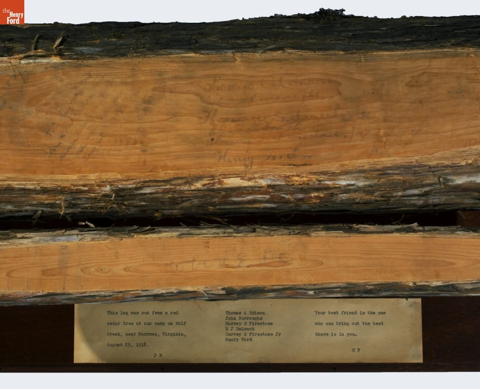 In August 1918, Henry Ford, Thomas Edison, Harvey Firestone, and naturalist John Burroughs embarked on a camping trip through the central Appalachian Mountain range. The self-named Vagabonds enjoyed hiking, exploring, sightseeing and just being in each other's company. The four Vagabonds and invited guests signed this log -- a souvenir of their outdoors adventure.