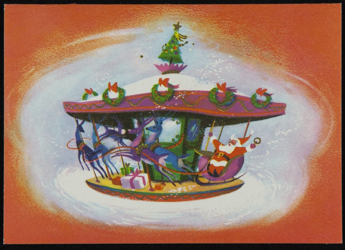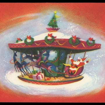 Christmas Card Showing Santa Claus and Reindeer on a Carousel, circa 1955