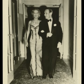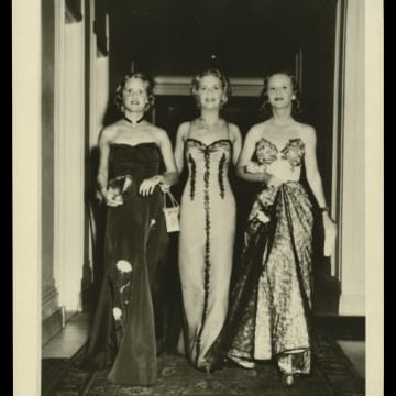 Elizabeth Parke Firestone, wife of tire magnate Harvey S. Firestone, Jr., cultivated a refined sense of fashion. Her fashion choices not only reflected her years of interest in clothing design and collaboration with world-renowned couturiers, but also highlighted her family's social standing. Firestone wore this jacketed dress -- by American designer Carrie Munn -- to her 25th wedding anniversary celebration at New York's Ritz Hotel.