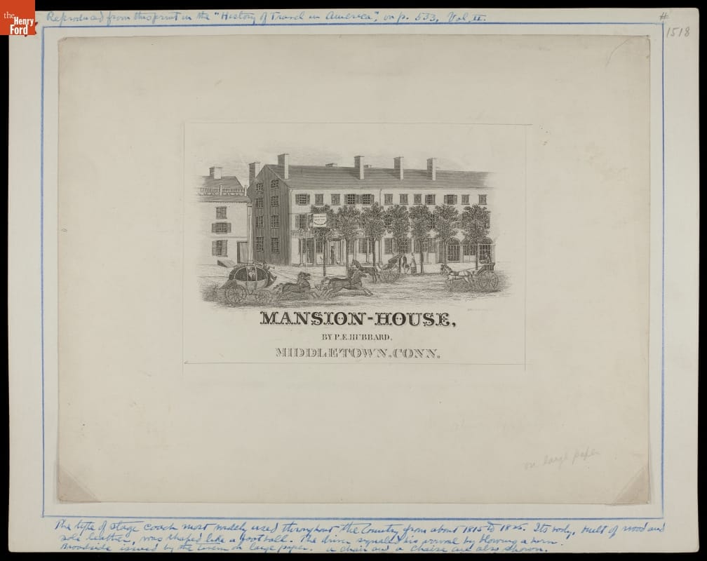 Built by Samuel D. Hubbard around 1827, the Mansion House served as a stagecoach stop providing meals and lodging to weary travelers passing through Middletown, Connecticut. The hotel also catered to local residents as a site for meetings and public celebrations. One notable party commemorated builder Samuel Hubbard's 1852 appointment to the office of United States Postmaster General.