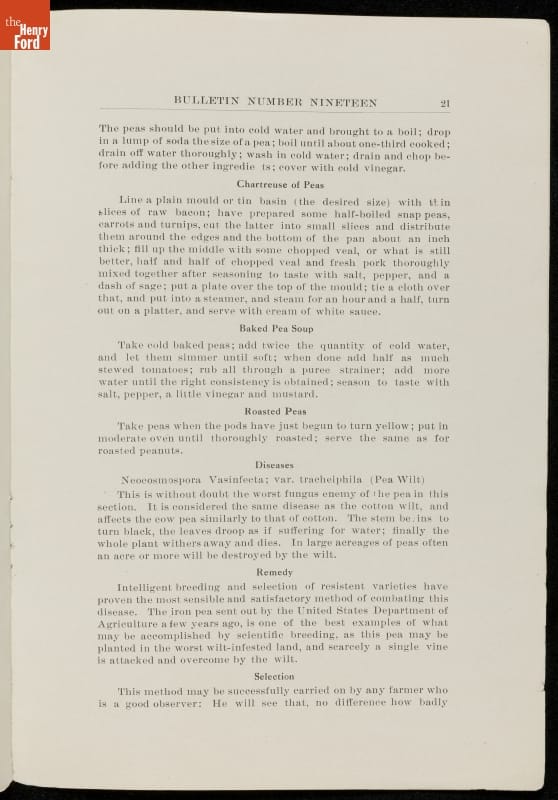 Among George Washington Carver's scientific contributions were the bulletins he issued from the Experiment Station of the Alabama state extension service that he established at the Tuskegee Institute. Carver wrote what he called "threefold" agricultural bulletins, with information for farmers, teachers, and housewives. This bulletin taught readers that cow peas were good for depleted soils as well as good to eat.