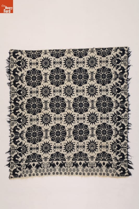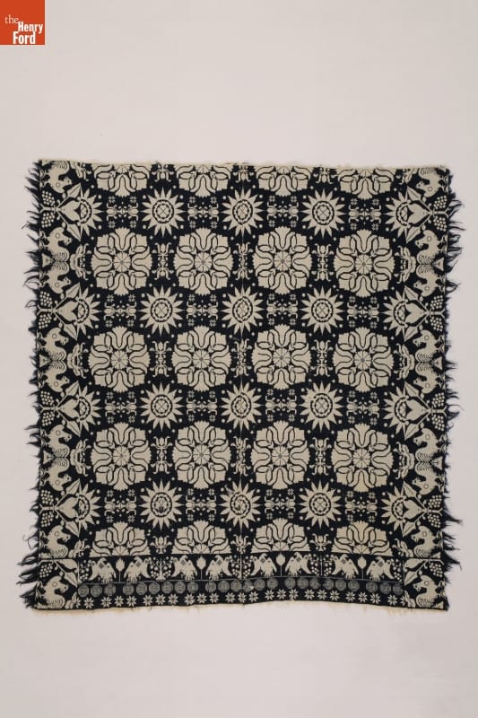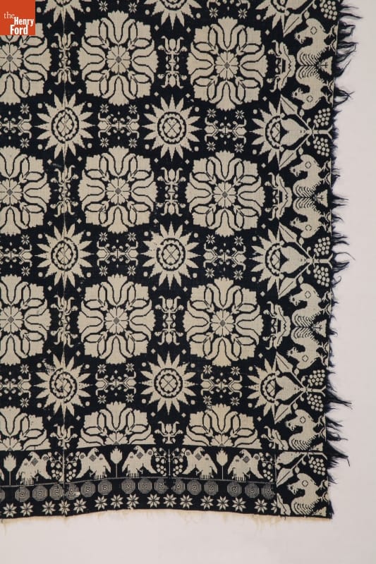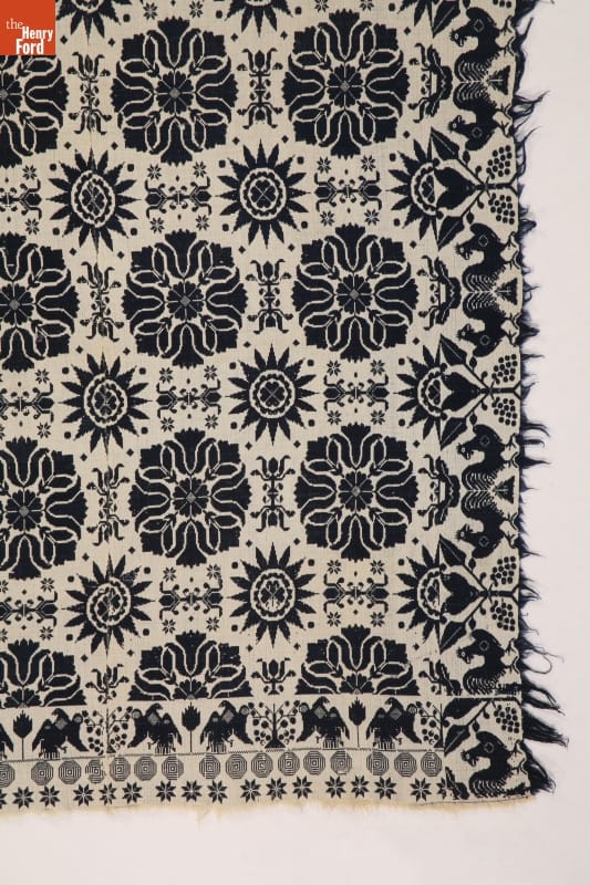 A coverlet is a decorative bedcovering--usually made of cotton and wool--woven on a loom. Fancy coverlets were made to order, offering their clients a choice of patterns and colors. This coverlet's exuberant design features tulips, hearts, stars, eagles, fruit trees, grape clusters, and roosters, all woven in the classic colors of blue and cream.