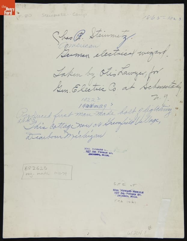 on back: Chas. P. Steinmetz / German [crossed out, American substituted] electrical wizard. / Taken by Otis Lawyer, for / Gen. Electric Co. at Schenectady, / N.Y. / 1865-1923 / 1922? / Produced first man-made bolt of lightning / at G.E. / This cottage now at Greenfield Village, / Dearborn, Michigan purple ink stamp on back: Mrs. Howard Mericle / [...] Mich