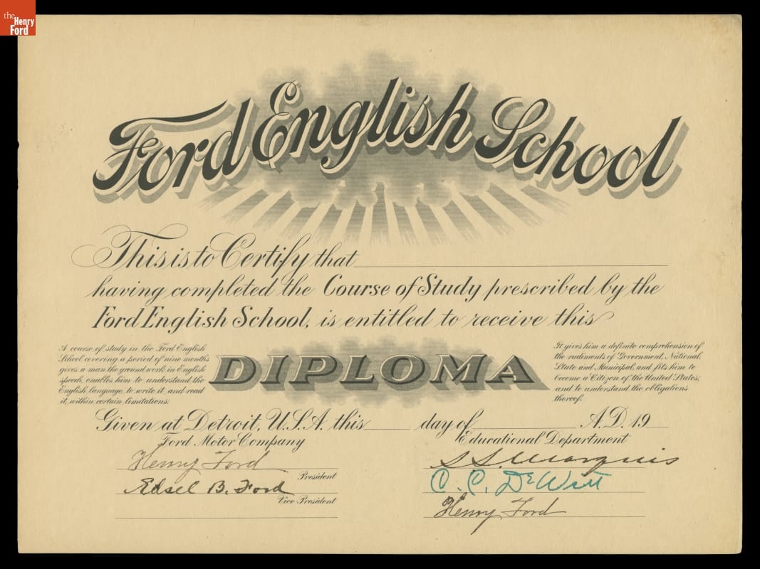 Ford English School This is to certify that ____ having completed the Course of Study prescribed by the Ford English School is entitled to receive this DIPLOMA [signed] Henry Ford Edsel Ford S.S. Marquis C.C. DeWitt