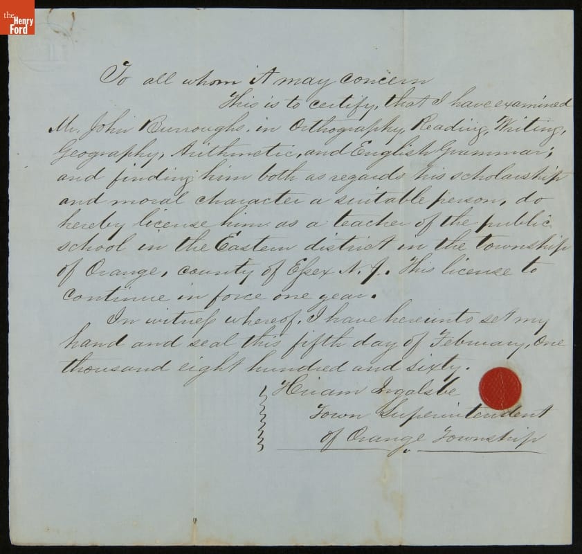 Teaching Certificate for John Burroughs, from Orange Township, New Jersey, February 7, 1860
