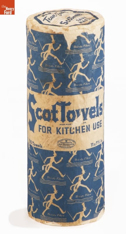 On front of paper wrapper: ScotTowels/ FOR KITCHEN USE/ [...]/ 11 X 7 1/2 inches On repeated pattern: Thirsty Fibre On back of paper wrapper: 10 Ways to Save Time, Laundry with ScotTowels./ Drying or Wiping Hands; Cleaning Pots and Pans; Draining Foods--Bacon, etc.; Wiping Up Spilled Liquids; Wiping Off Stove; Wiping Out Sink; Scraping Plates; Wiping Windshield; Drying Foods/ Cleaning Glassware