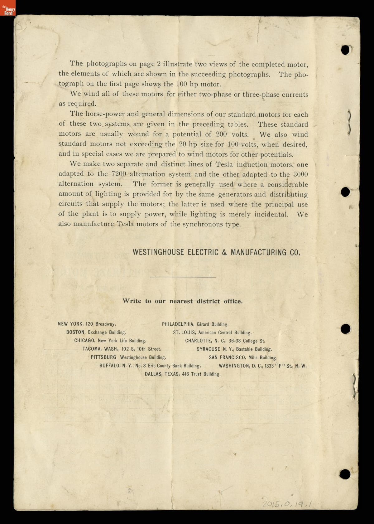 Catalog for Westinghouse Standard Polyphase Tesla Motors, October 1895