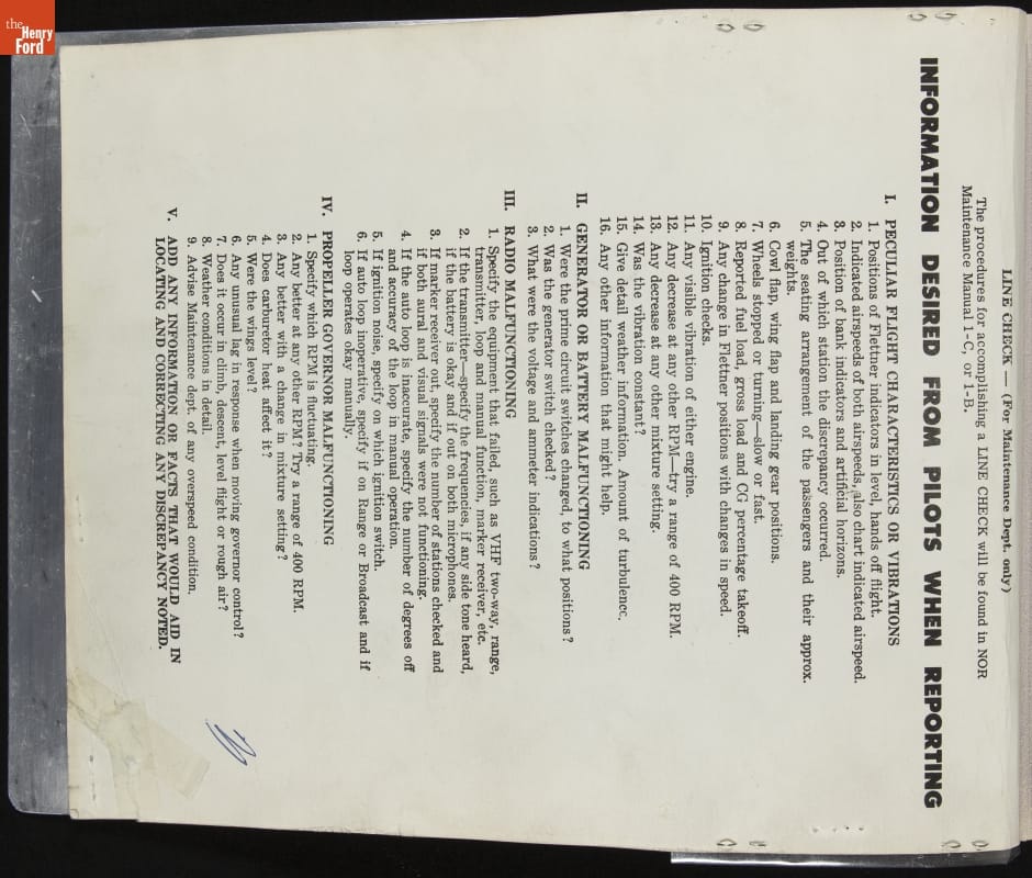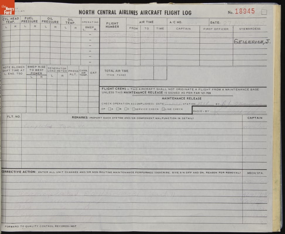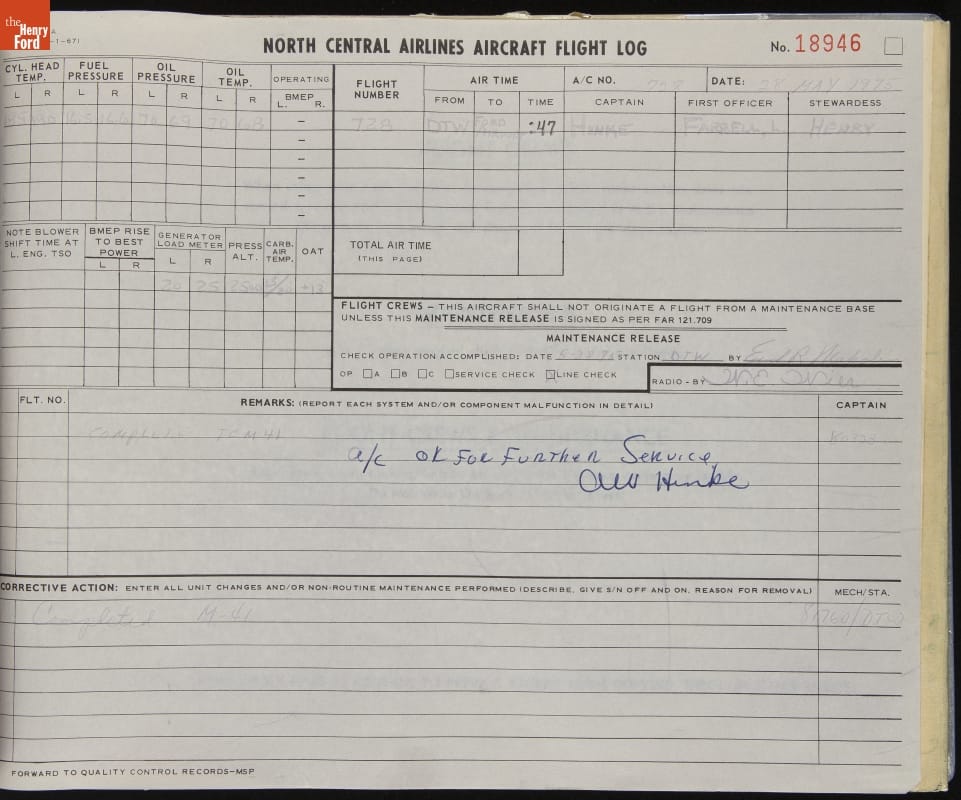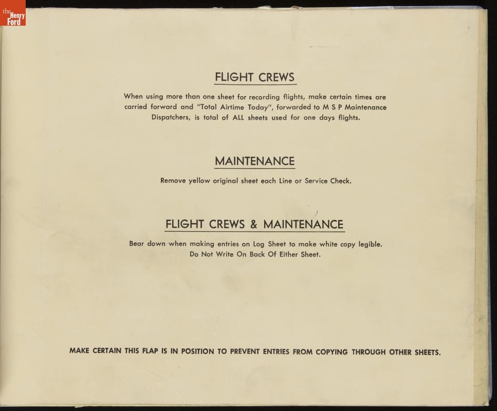 Airplanes require careful maintenance, and each flight must be thoroughly documented in a logbook. This book, for the final flights of the Douglas DC-3 in The Henry Ford's collection, records everything from crew members' names, to flight times, to the operating temperatures of the engines' cylinder heads. Equipment malfunctions and subsequent repairs are noted as well.