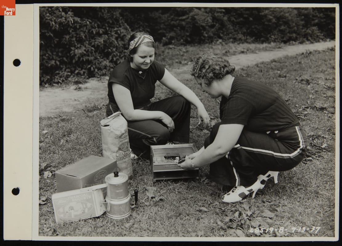 Ladies Using Ford Charcoal Briquets and Grill at a Picnic, 1937