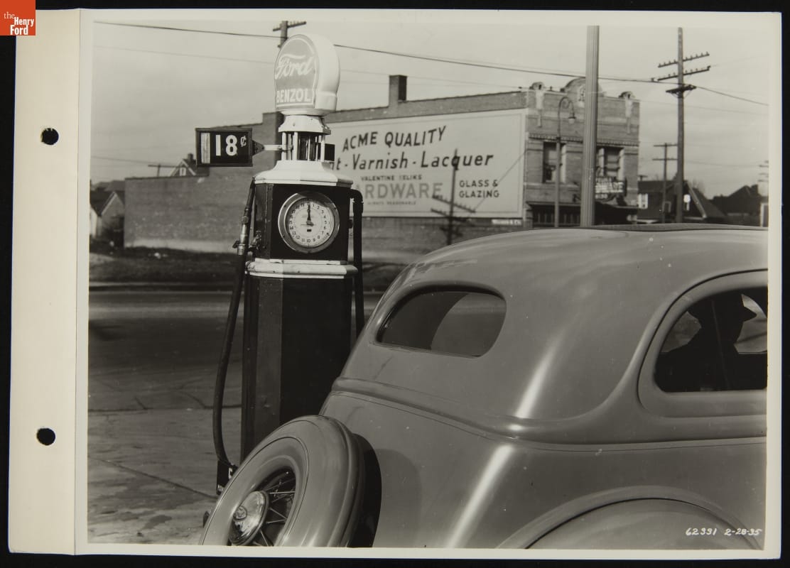 Ford V-8 Automobile by a Gas Station Pump, February 1935