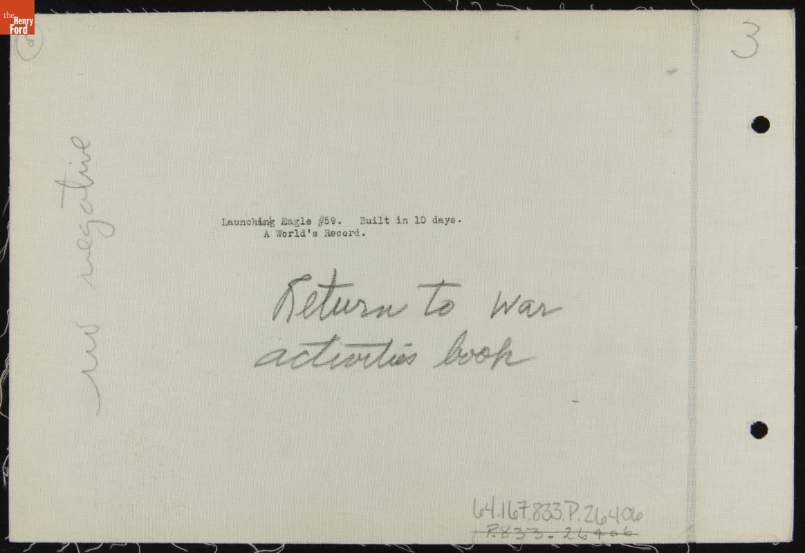 With America's coastal shipbuilders pressed to the limit, the U.S. Navy turned to Ford Motor Company to build Eagle anti-submarine patrol boats during World War I. Henry Ford proposed to manufacture the boats using the same mass production techniques he perfected for the Model T. Ford built 60 Eagles in total, with boat #59 constructed in a record-setting ten days.