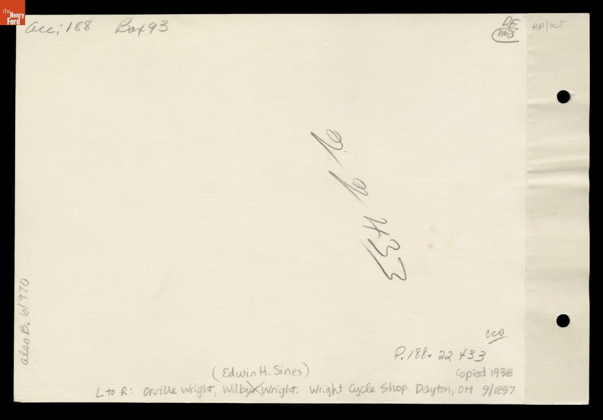 Orville Wright (right) was photographed alongside friend and former schoolmate Edwin H. Sines in the Wright brothers' Dayton, Ohio, bicycle shop. The Wrights' experiences building printing presses and bicycles sharpened their skills in precision machining. These talents were invaluable in their later efforts to build the first successful heavier-than-air, powered aircraft in 1903.