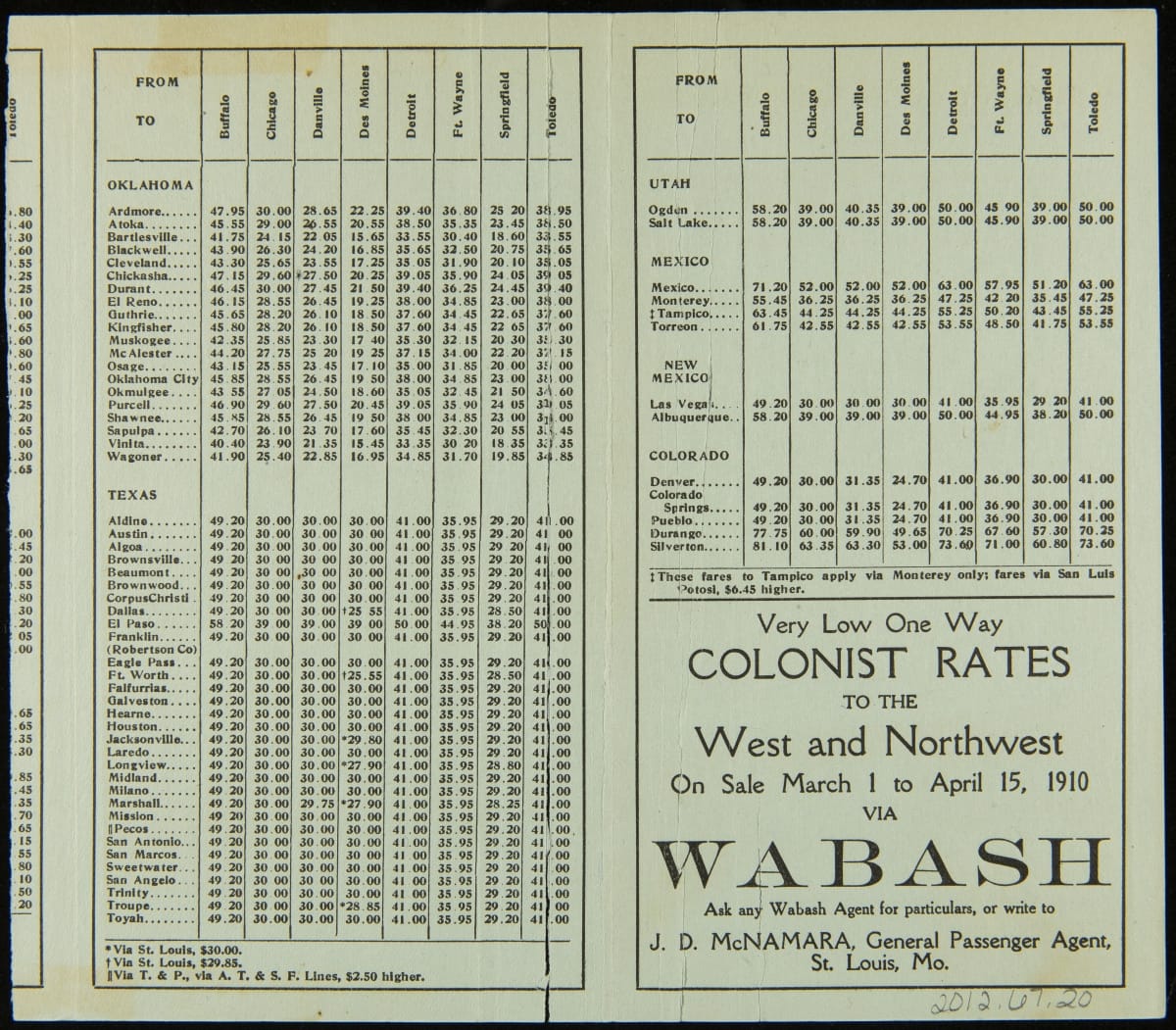 The Wabash Railway, with origins dating back to 1838, was a strong Midwestern carrier until Amtrak took over the national passenger railroad system in 1971. This timetable promoted Wabash's service to Kansas City. Special "homeseekers" or "colonist" fares provided low-cost, one-way service for immigrants traveling to start new lives in the western United States.