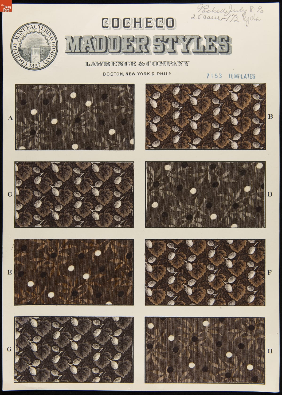 Sample Card for Textile Fabric Style No. 7153, "Templates," Cocheco Mfg. Co., July 8, 1890
