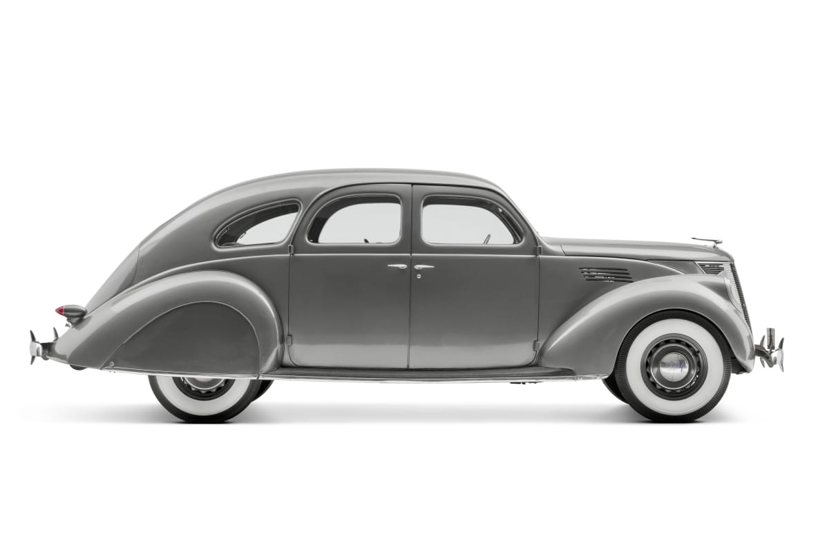 Automobiles, like other everyday objects, underwent streamlining in the 1930s. The 1936 Lincoln Zephyr joined aerodynamic styling with attractiveness. Its flowing teardrop shape suggests motion. Its V-shaped grille slices the air. Headlights blend smoothly into the front fenders. Rear fenders hug the body and fender skirts hide the rear wheels. Even the taillights are streamlined. The Zephyr was a streamlining success.