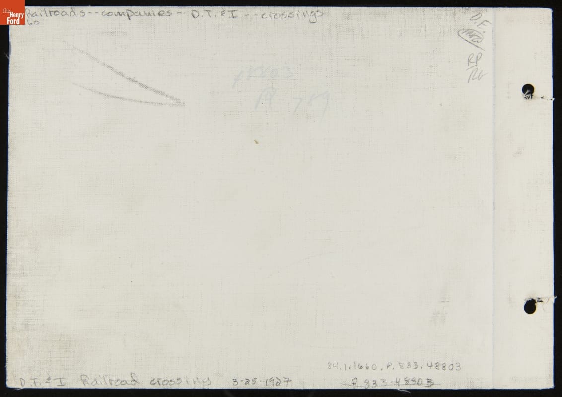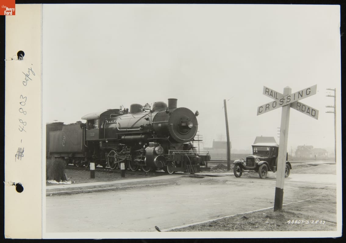 Automobile Waiting at Railroad Crossing for Train to Cross the Road, December 1927