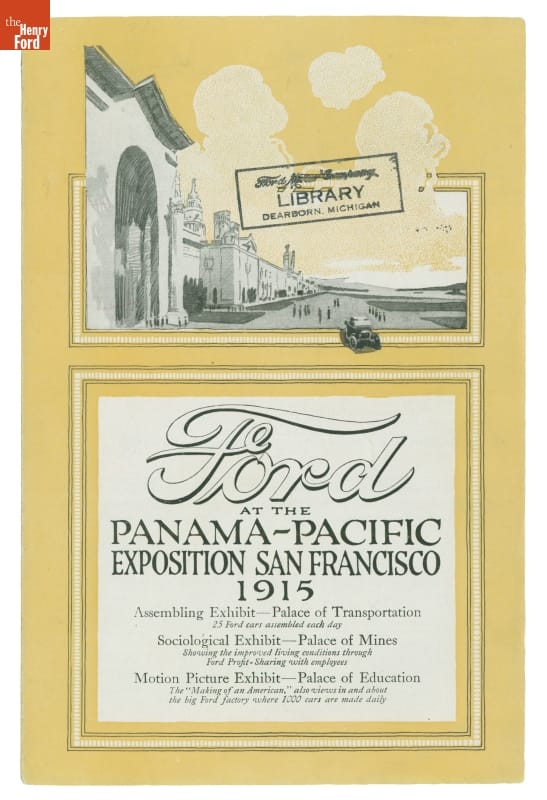 Printed on front: Ford / AT THE / PANAMA-PACIFIC / EXPOSITION SAN FRANCISCO / 1915 Stamped in ink on front: Ford Motor Company / LIBRARY / DEARBORN, MICHIGAN