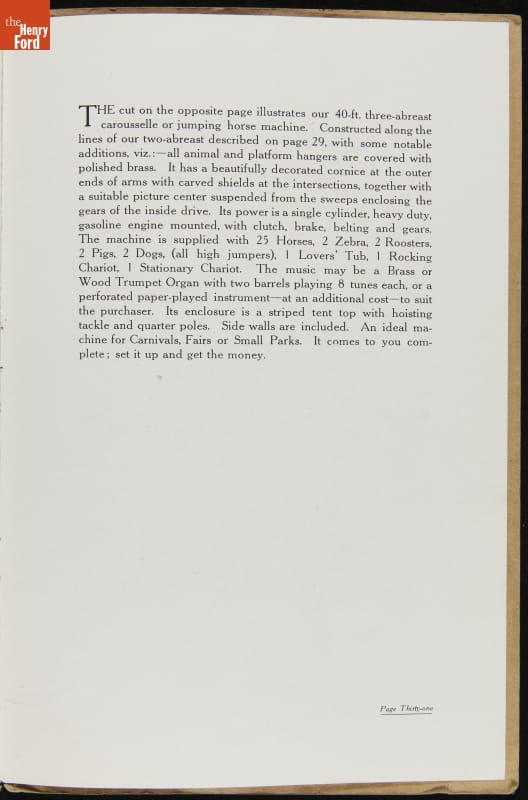 This catalog highlights the products of Herschell-Spillman Company, from portable merry-go-rounds to large stationary "carousselles." This company, one of the most popular and successful American carousel manufacturers of the early 20th century, combined a method of shop production to produce carved wooden animals with their expertise in steam engines and boilers for efficient operation of their merry-go-rounds and carousels.