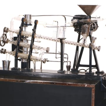 Ford promoted soybeans at the World Fairs and Exposition of the 1930s. In this image, a presenter at the Texas Centennial Exposition demonstrates how the soybean extraction process works with a model of a soybean extractor.