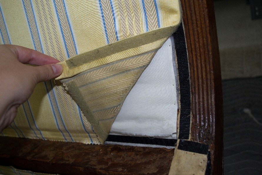 After a long search, a historically-appropriate replacement fabric was selected for the show cover. We began removing the layers of upholstery materials and padding.