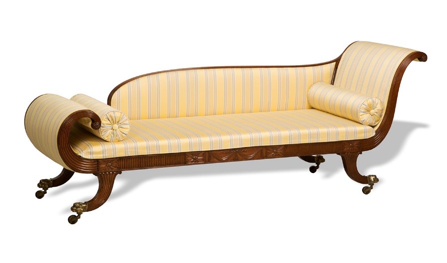 Our graceful Grecian couch is about 200 years old and is believed to have been made in the workshop of Duncan Phyfe in New York City. In its time, this couch was considered the best piece of upholstered furniture in a well-appointed parlor of a sophisticated New Yorker. Although these couches seem to be designed for reclining, they were not intended for repose. They were used by fashionable ladies and gentlemen, who sat in a rigid, upright position. Today, we would find sitting on this couch very uncomfortable.