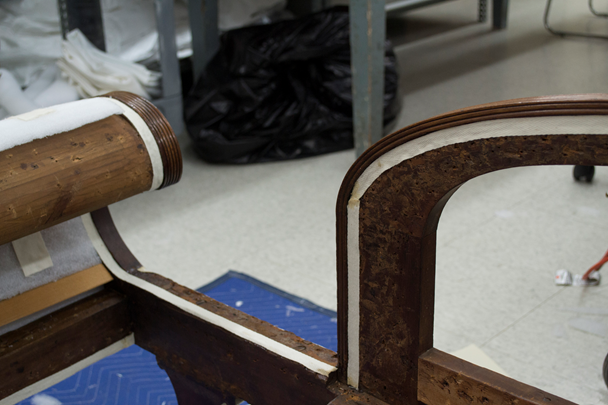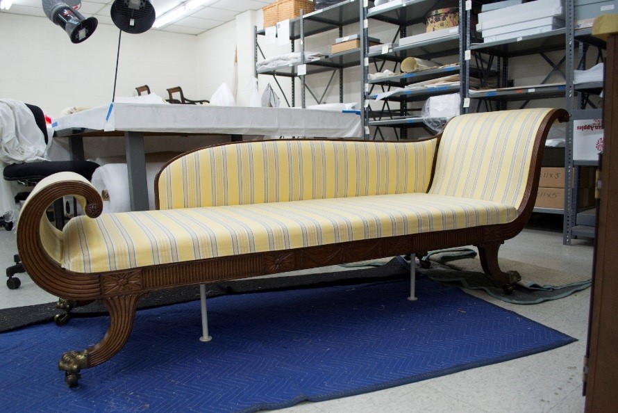 It is amazing that such a specialized piece survived intact into the early 20th century, when it was acquired by The Henry Ford. This is perhaps due to the flamboyant design of the back and foot rests, which makes it an exceptionally elegant, almost sculptural, piece of furniture. The couch was last reupholstered in 1954 by Ernest LoNano, a well-known furniture restorer of the time. Since then, the upholstery had become quite dirty and worn.