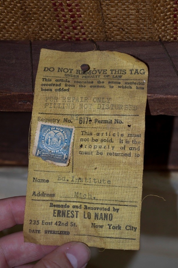 We discovered this intriguing tag inside the upholstery—apparently New York law required a strict accounting of materials used.