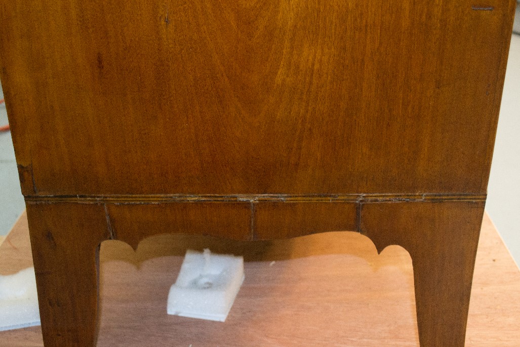 The conservation of this chest of drawers started with a detailed examination to identify every area of damage to both the finish and the structure of the artifact. Each area of damaged veneer was labeled using a small piece of removable tape and the item was photographed.