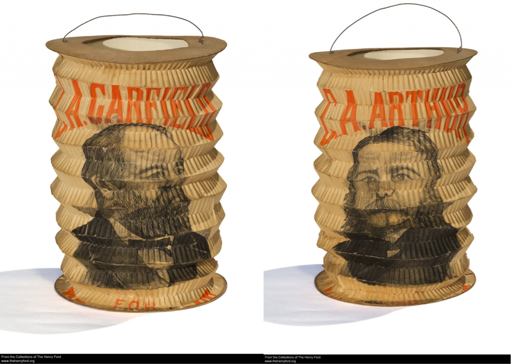The Henry Ford holds an extensive collection of late 19th century political campaign lanterns, dating from the 1860 to 1900.  These paper, accordion-folded lanterns usually held candles and were used in processions and rallies in support of the candidates. They are screen printed in patriotic colors - some contain images of the candidates and/or slogans.  In an age before television and radio, processions were a method of attracting attention for a political race.  As paper objects these are truly ephemeral objects.  Their survival for more than 100 years is remarkable.