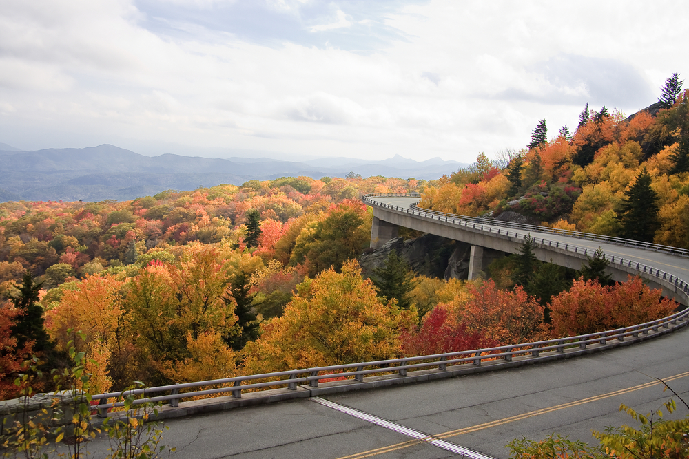 Snake your way through the winding mountain terrain on the Blue Ridge Parkway in Asheville, North Carolina. While the overlooks and panoramic views are majestic year round, weave along the twisting paths during the autumn months to witness the fall foliage spectacle. During this special time of year, you can marvel at nature’s own fireworks as the road bursts to life with red, orange, and yellow leaves that uniquely envelope the passageway.